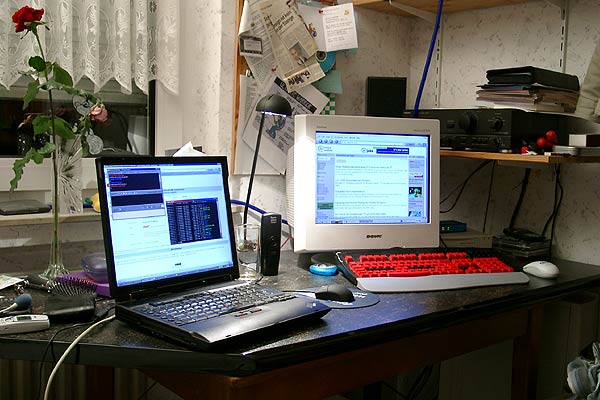 On the left it's my IBM A31 laptop with 1.8 GHz, 256 MB RAM, 40 GB Harddisk, 15" FlexView Display and Wireless LAN.